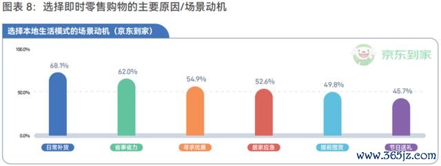 根据 2023 年京东消费者调研显示,使用即时购物的主要原因中,日常性和便利性排在应急类需求前,京东到家调研数据也显示,日常补货和省时省力是用户排名前两名的场景动机。也就是说,当消费者越来越习惯使用即时零售服务,即时购物会变成一种更日常的消费方式。