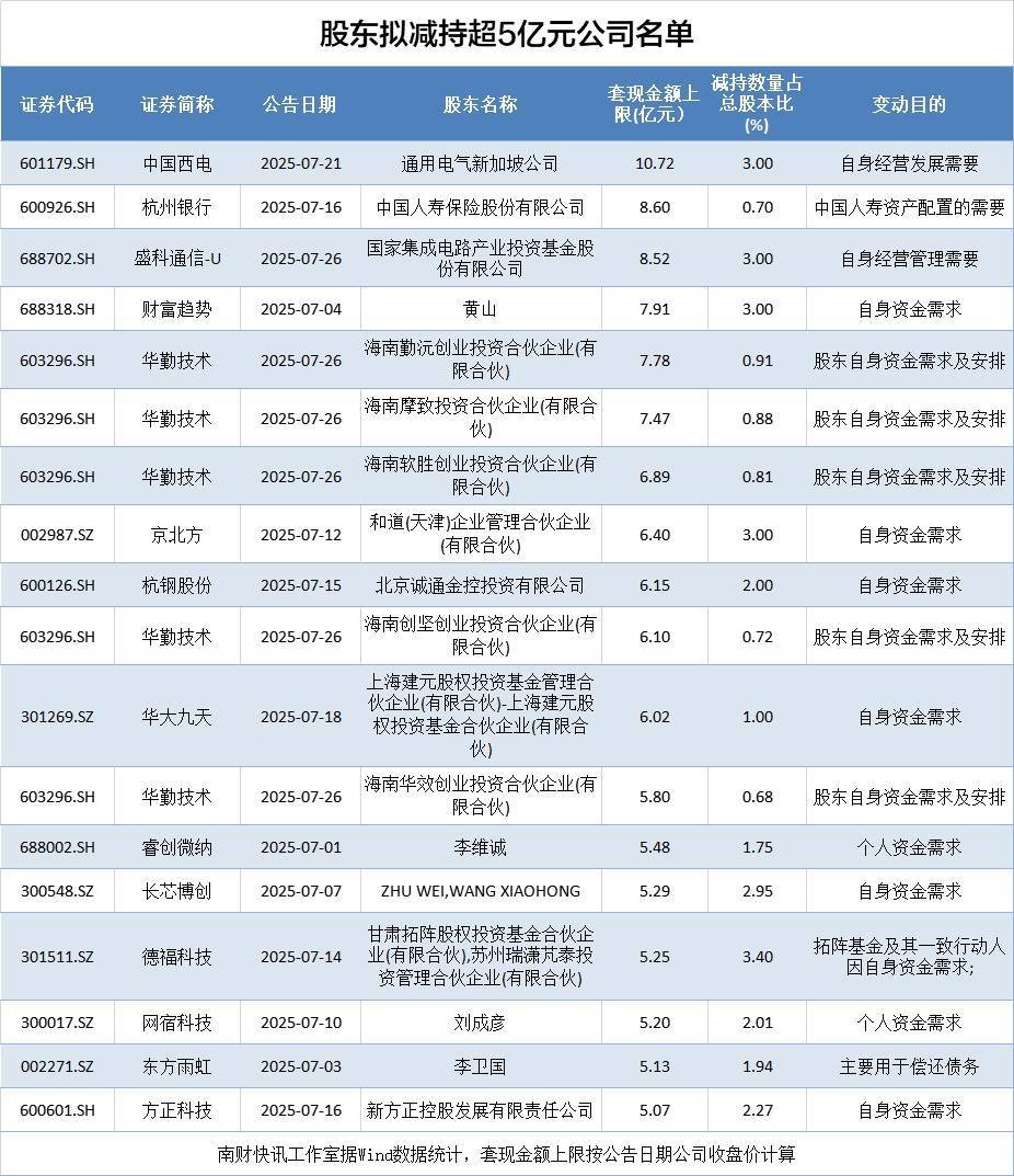 创投基金批量退出则是另一大主力。国家集成电路产业投资基金7月连续减持赛微电子(300456.SZ)、盛科通信(688702.SH)等个股。绿通科技(301322.SZ)、ST逸飞(300670.SZ)、国义招标(831039.BJ)、甘李药业(603087.SH)、欧林生物(688319.SH)等亦因基金到期或资金需求遭减持。
